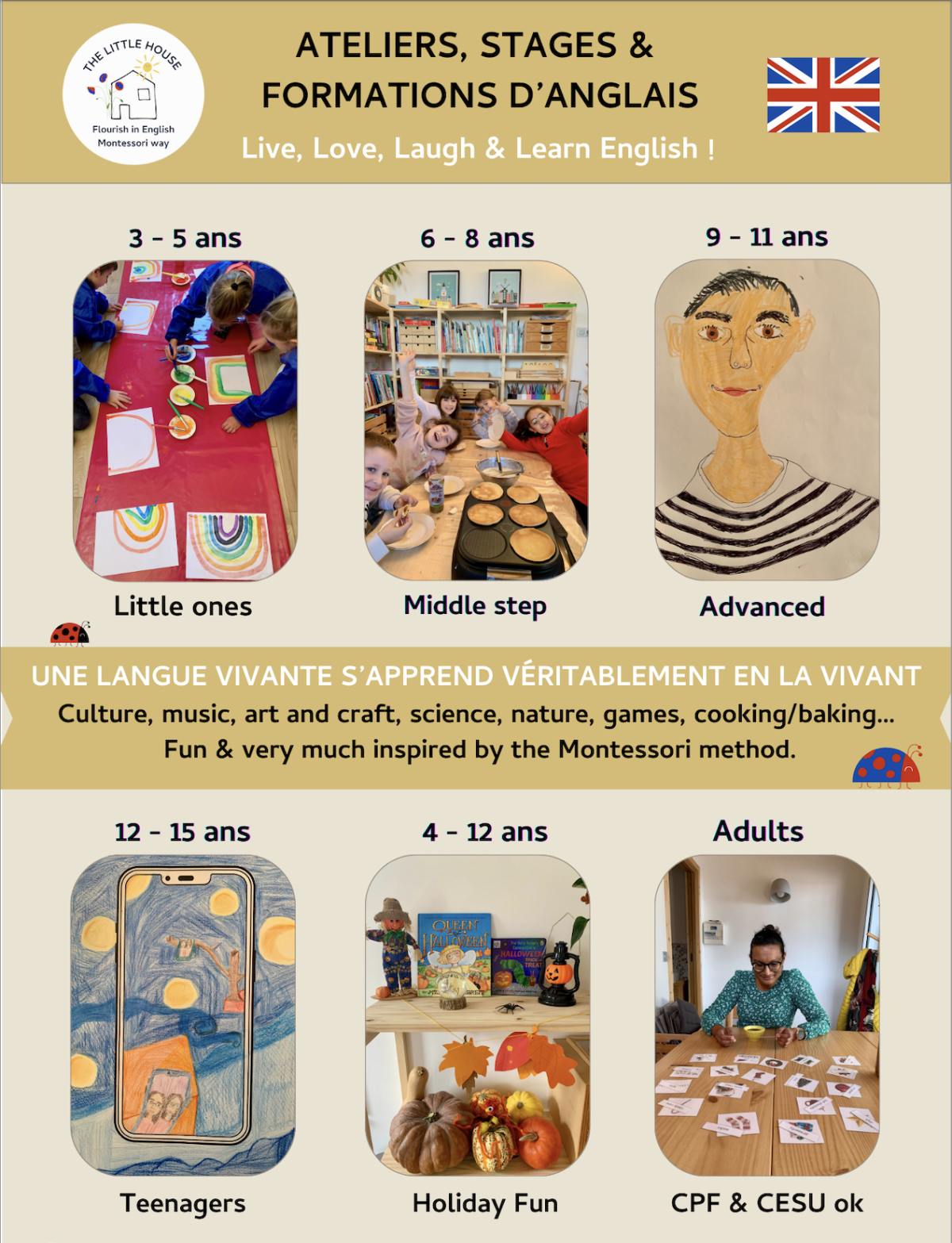 La petite maison où se développe la sensibilité de se rencontrer et partager en anglais. Une fenêtre ouverte sur le monde, tel un lieu où l'on s'épanouit, aussi bien que l'on cultive ses compétences linguistiques. Un espace habité par des valeurs favorisant un apprentissage plein de sens: ludique, créatif, musical, culturel, à travers le jeu et le mouvement, au jardin, en cuisine, en se plongeant dans des histoires, des énigmes, des activités manuelles, des chansons...